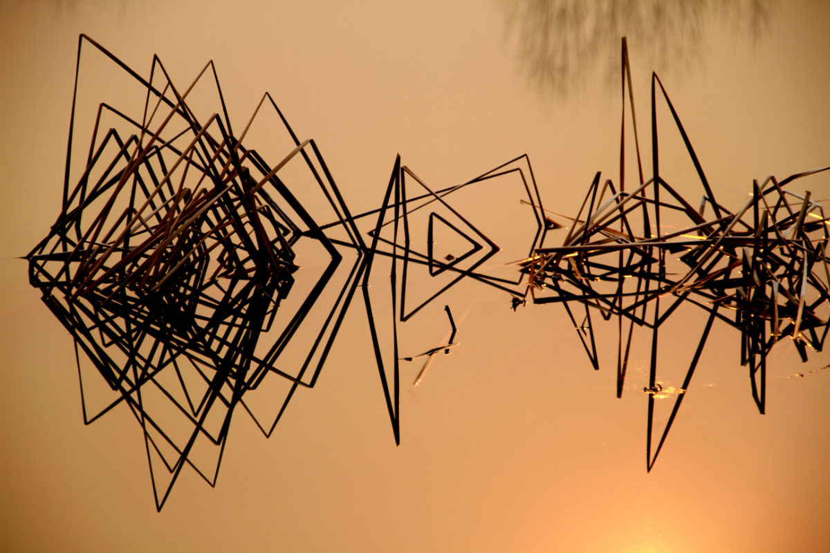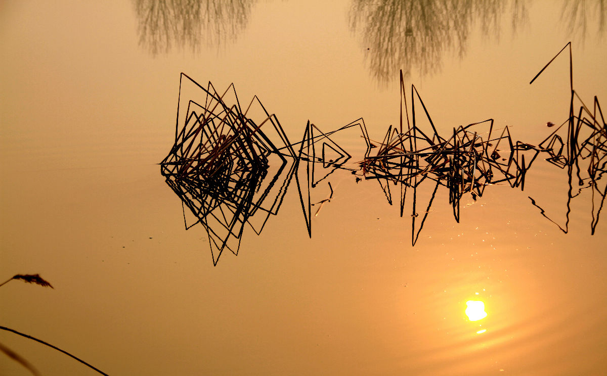 又看到野鸭了,并且在准备离开的时候,无意间发现水边的一组倒影,肯定是ai尚先生拍过的(落日红辉 金色遐想)。不过,不如原来好看了,少了弯弯线条的几根芦苇
