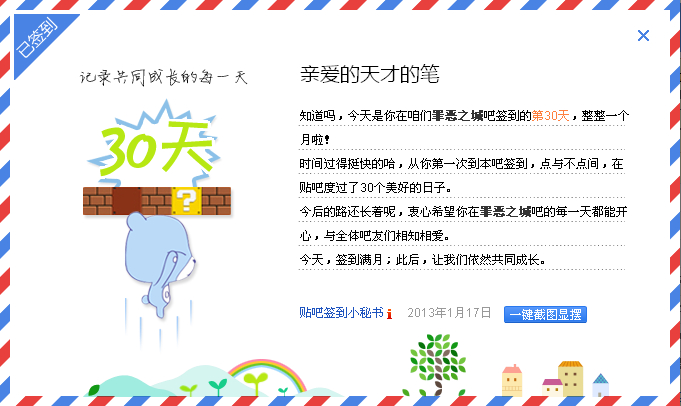 在本吧已累计签到30天了,截图留念一下下