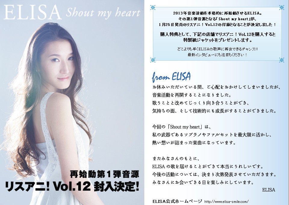 2012年4月14日,在官网上发出声明:已经得到足够的修养,今后将继续演唱anime歌曲。