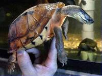 日本鸟羽市水族馆一只壳上长有人脸图纹的螃蟹(右)趴在它刚刚蜕下的壳边。这只奇特的螃蟹是一名八岁男孩在海边捉到后交给水族馆的。