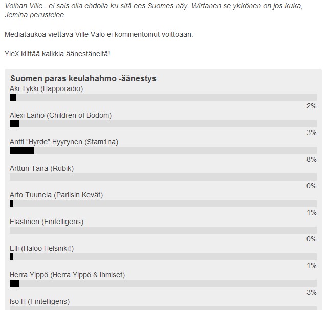 Ville Valo是芬兰最佳乐队的主唱!YleX组织芬兰最佳乐队的主唱投票,这是很受欢迎的。周期间,被评为最好的领导者高达16 778次总冠军是HIM的VilleValo,谁得到的总票数的18%,或3,037票。二是迈克尔·梦露,接受1,553票,第三个地方Apulanta托尼Wirtanen,谁得到了1546票。预先选定的候选人除了一些声音,人也CMXYrjänäAW,NGT的JonneAaron和诗人的秋季,马尔科Saaresto