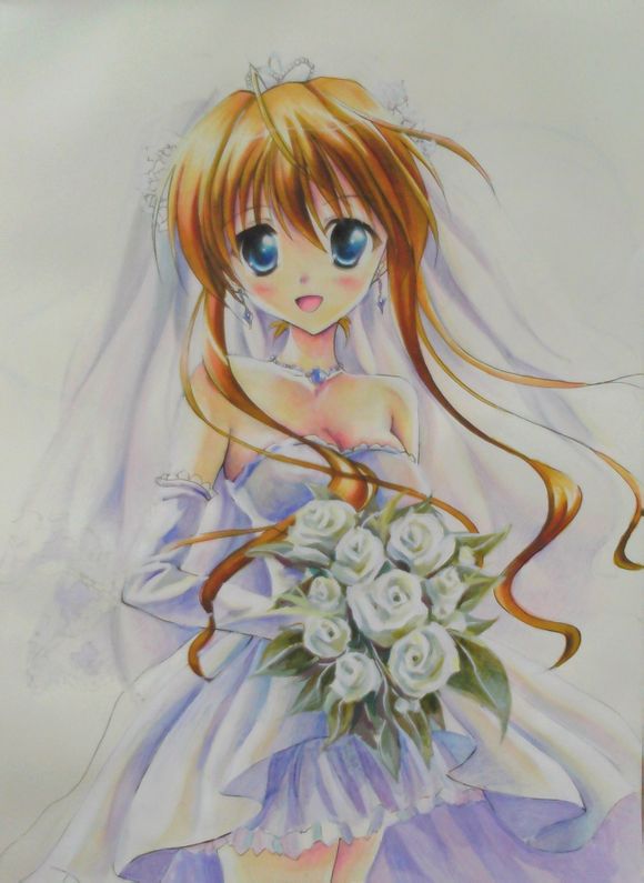回复 默榕 :至于柔和的感觉,因为我是用了马克笔和彩铅的混搭使用,所以人物后面的婚纱是使用彩铅。而人物穿着的婚纱是用马克笔先涂得浅浅一层,过度完全交给了彩铅完成。完全马克笔的制作只有头发。当然其中还有颜料的帮忙,所以不完全是马克笔的力量。