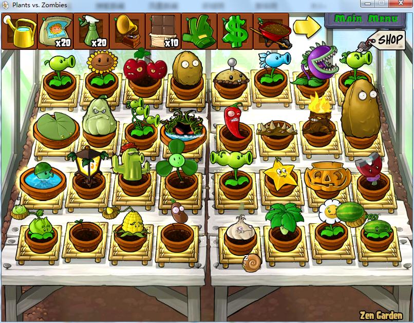 可惜没有花盆,打了两年没花盆,只好用修改器修出一个。(其他都是自己打出来的)就差蘑菇花园中的大喷,胆小和毁灭了。