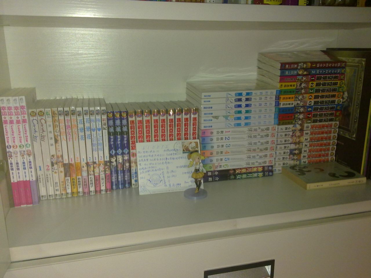 柜子里面那个学姐45,上次结业考试完了开的。手办的话小的像这种四五十,大的比如昨天在店里看到的那只奸笑的圆神一千多。我这堆书500,是只有一半了。柜子里总共也就一千二三的样子。