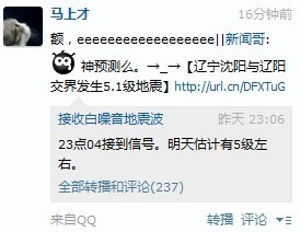 回复 扬哥最给力 :我不是 我看新闻看说沈阳地震五点一级