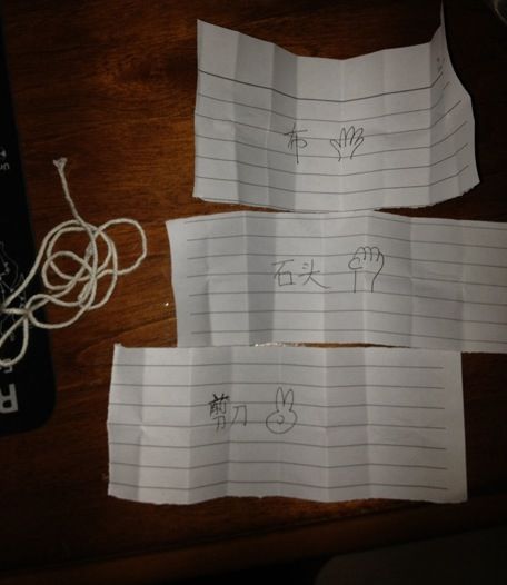 准备三张大小一样的纸条' 可以画图或者不画( 推荐画, 形象)。 在折起来之前' 把宝宝叫到身边' 开始一张一张的讲纸条上面的意思'和石头剪刀布这个游戏的规则。 一定要讲详细'不断告诉孩子如何可以赢' 多讲几遍不要怕麻烦'