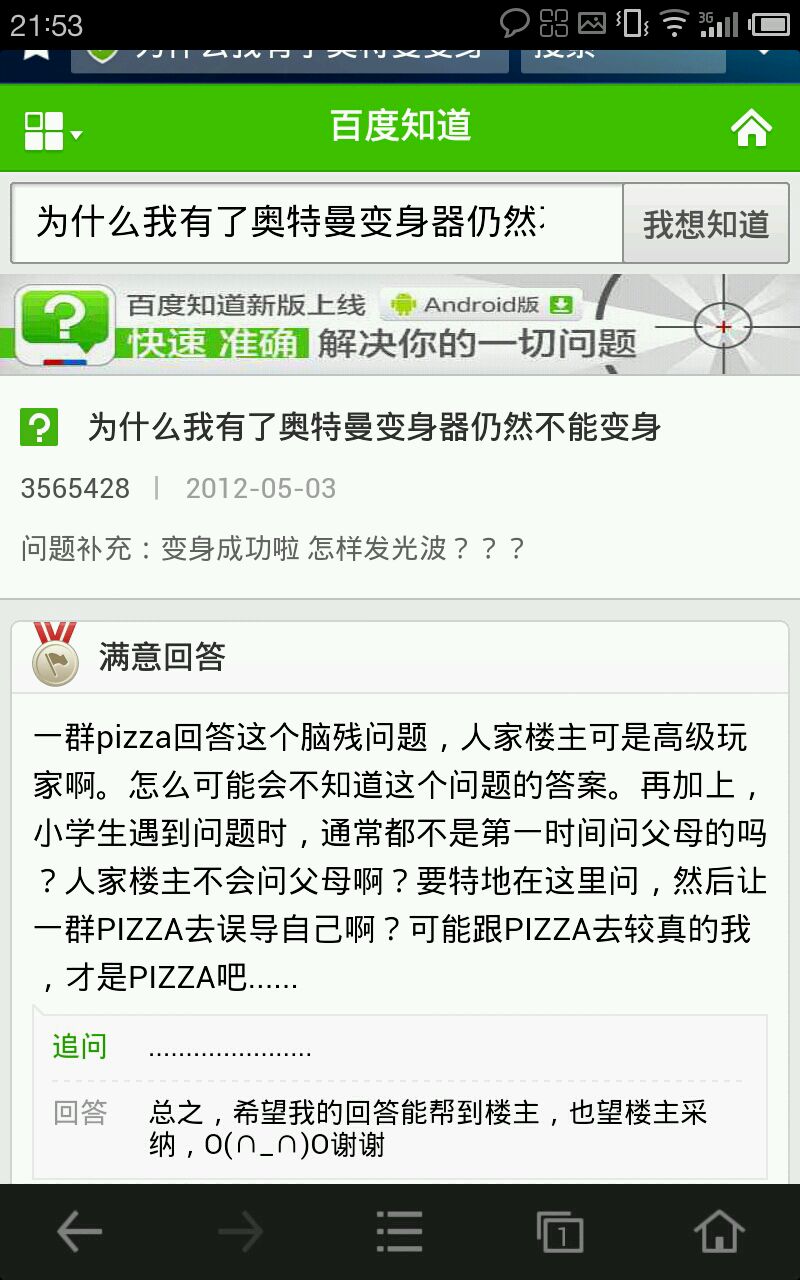 第三个联想结果是“为什么我有了奥特曼变身器仍然不能变身”。搜索后有个神回复