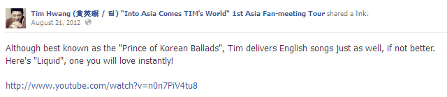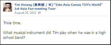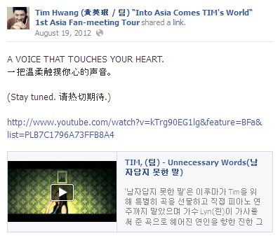 本楼内容除非特别注明,全部源自 Tim Hwang (黄英珉 / 팀) "Into Asia Comes TIM's World" 1st Asia Fan-meeting Tour 脸书官方专页,转载请注明出处,谢谢~