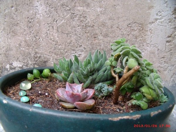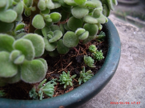盆里的品种有:碰碰香、绒针、姬星美人、薄雪万年草、紫珍珠、佛珠。