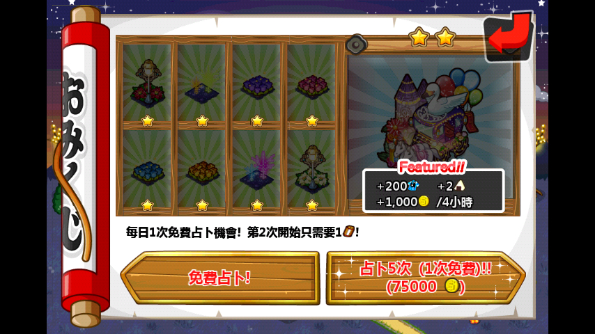 每天有一次免费占卜的机会,额外的免费占卜需要15000金币或者用系统赠送的免费占卜券.