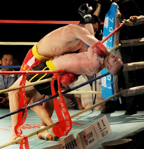 2012年4月21日,中国选手王文忠(左)在90公斤级比赛中战胜加拿大选手丹尼尔。当日,2012年重庆黔江搏击赛暨世界泰拳王中国挑战赛在黔江体育馆举行。 新华社记者陈诚摄