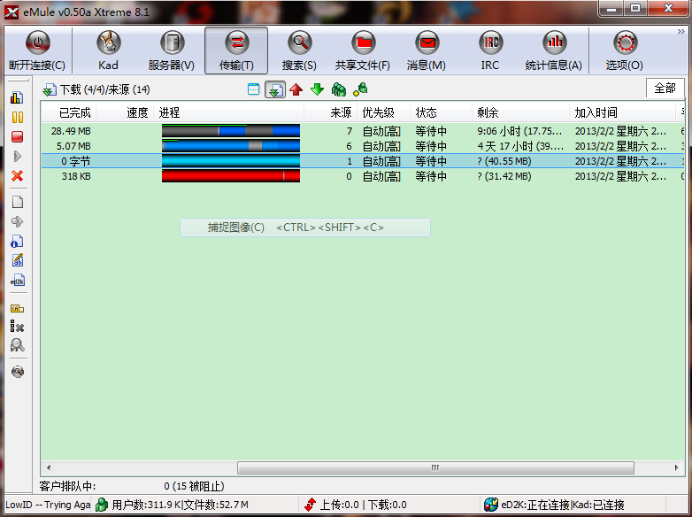 emule是文件分享工具,你所下载的每一个字节都是其他骡友正在为你上传。如果其他骡友上传能力有限,又有很多人从他那里下载,就需要有序排队来轮流下载。这就是队列。图中的“来源”是能为你提供这个文件的骡友数量,双击所下文件,打开客户端列表,会发现在每位骡友处的队列数,平均队列就是这些队列数的平均值。
