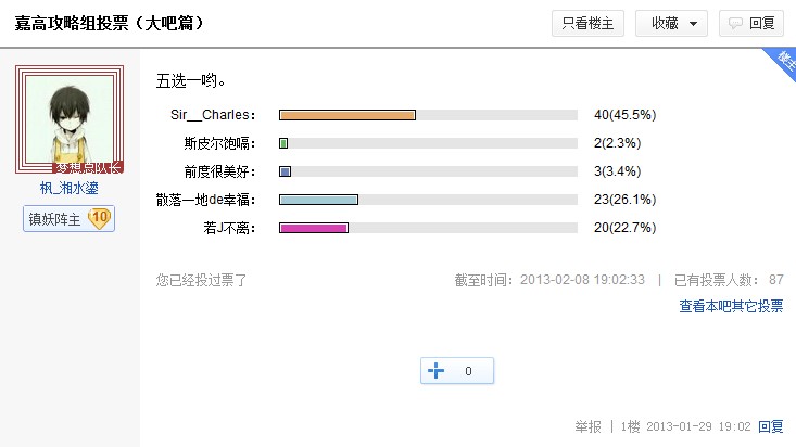 贴吧:嘉兴高级中学→嘉高攻略组投票(大吧篇)→若J不离 截图回复在这里就可以了哦