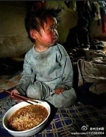 记者在中国一贫困山区采访时拍摄的一张照片----记者对孩子的母亲说:尽量让孩子少吃这些油炸的速食垃圾食品。孩子的母亲说“没关系,不经常吃。但是每年都会给孩子煮一次,因为今天是孩子的生日,其实我们根本舍不得吃”