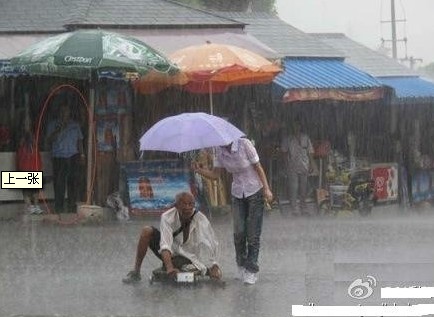 因腿部残疾而只能靠讨饭维生的大爷来不及避雨,只能望雨兴叹。突然,老人的头上多了一把雨伞。老人疑惑着抬起头,却看到了一位美丽的姑娘,雨伞已经完全偏向于老人,自己上衣、牛仔裤、运动鞋却完全湿透。而另一名制服男,却在棚下避雨,远远观望
