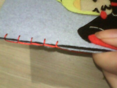 按手机大小裁出布料,(因为做手机套,所以身上的线条都已经用线缝上了)最好再用不织布才出一块同等大小的布垫在里面。不然容易挂到后面的线,而且做出来的手机套也会厚实些...