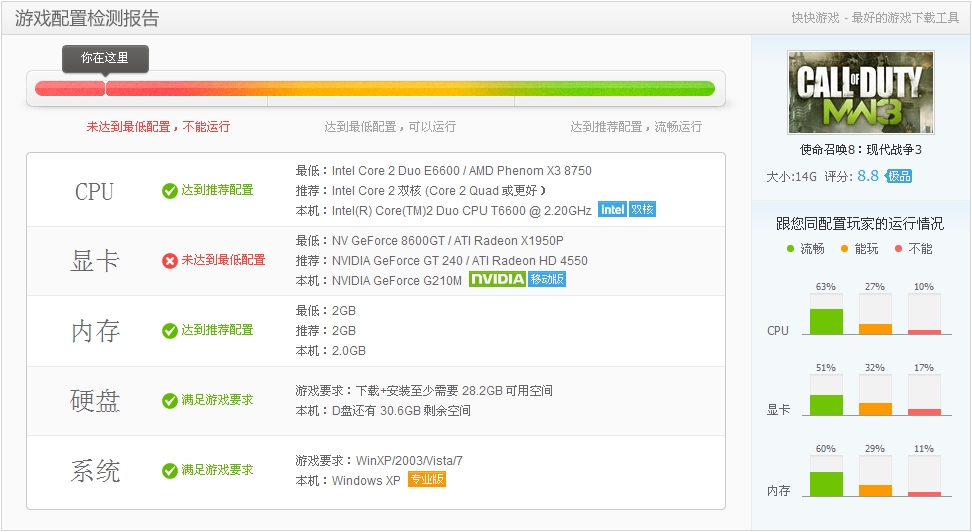 快快的检测是这个 我不知道能不能玩 就算是开画质最低 特效全关都行 4和6都差不多中高特效 求解答!