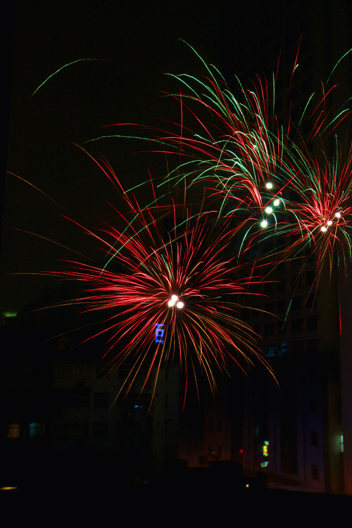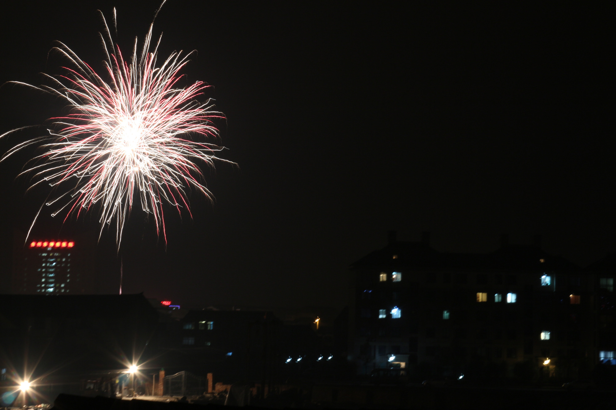 没办法,就在窗口拍,建筑下面是民房。。。P3增加曝光时间已经不顶用了。。。因为烟火已经散了,只能扩大光圈了