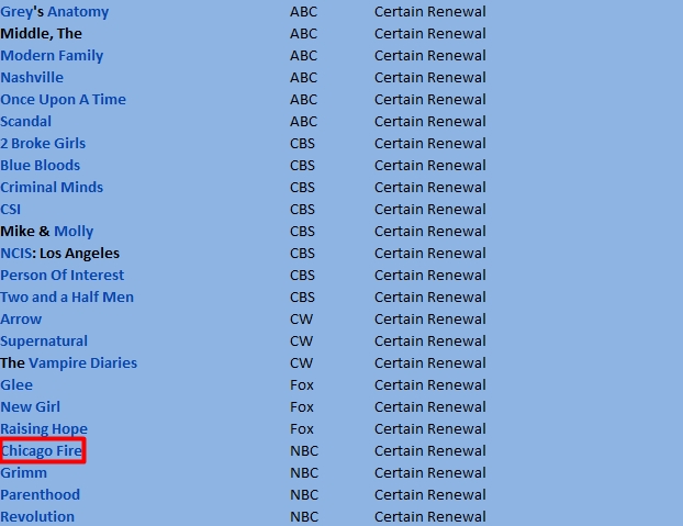 各剧续订情况预测表 Chicago Fire再升级