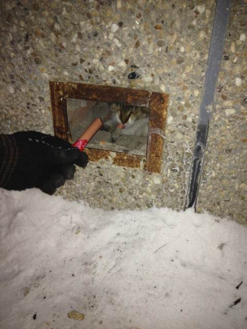 那是一个楼房的通风口还是什么的 外面有个铁丝网 有个朋友说在那看见猫了 我们就过去了 猫还在 一看我们下车就叫 我们把铁丝网掰开了 喂点吃的想逗它出来 后来发现它好像出不来了 我们就伸手把它拽出来了它也不叫 费了好大劲 它的尾巴好像是夹在里面了 后来把它救出来 过不一会儿它自己又钻回去了 都没来得及照相 过年带了猫罐头去看它 它已经不在那了 今天又去了也不在 看来那时候是真的困在里面了
