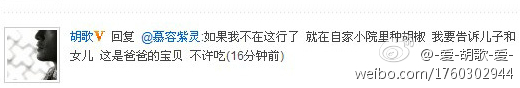胡歌 回复 慕容紫灵 如果我不在在这行了 就在自家小院里种胡椒 我要告诉自己的儿子和女儿 这是爸爸的宝贝 不许吃 【微博回复】
