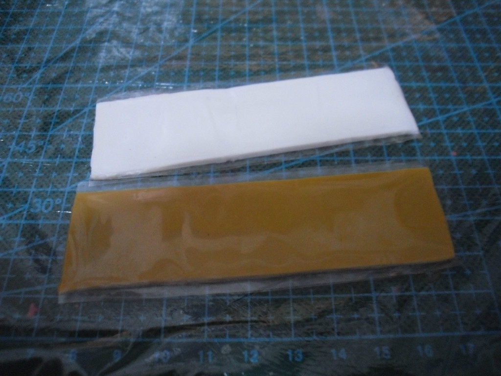 从包装和取出时如图是分别用塑料纸加塑料袋分开包装的2片 正因为这样包装在使用时只要对一起 然后剪刀剪下 比例基本就是1比1了 (千万别为了省地方 买回来揉成一团球。。。。切记。切记) 剪下需要的(宁可多不可少)用量后撕下塑料膜 揉成条状 然后拧麻花似的扭一起 然后揉成一个颜色就行了 (期间需要沾水以免粘手)