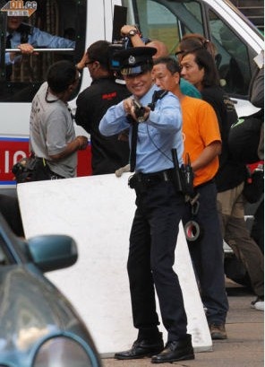 当时身处休息室的家辉与Daniel目击一切,不过二人却没有有怕。家辉则笑言拍摄时常有类似情况发生,他亦似乎较紧张自己揸长枪的姿势,不时练习。正式拍摄时,戏中由正变邪的家辉手执长枪向人群乱枪扫射,数以十发反应弹枪声震耳欲聋,现场烟海一片,一众临时演员争相闪避,被困在冲锋车内的Daniel远距离与他驳火,附近楼上住客纷纷探头“看热闹”,并掏出手机拍照。至于Daniel收工后即更衣离场,相信是赶回家照顾怀孕娇妻。