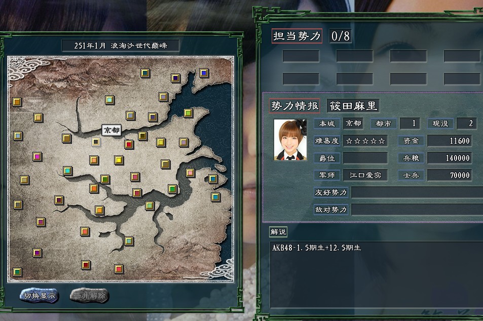 老麻的京都,左边是山本彩的NMB1期,下面是入山的akb时期10武将,右边红色是冈田奈奈的14期6武将,每城10W人……本队是老麻跟六神。