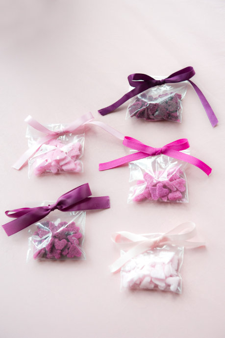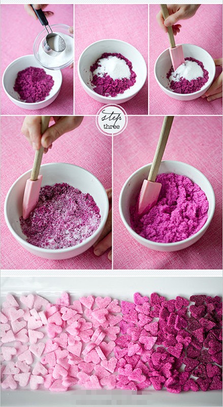 ep 1. 100g砂糖放入碗中,加入一点色素,混合均匀。一点点色素就可以染出很浓郁的颜色,所以要一次一点,小心地混入。耐心地调出你需要的最深的颜色。在混合好的彩色砂糖中加入5ml蛋清,混合均匀至类似湿的沙子的状态,蛋清不可以放太多,否则会溶化糖粒。 Step 2. 将混合好蛋清的彩色砂糖倒到案台上,用刮刀稍微整平,然后用擀面杖边擀边压紧,尽可能地让糖粒们结合得更紧实,厚度大约在7mm左右。用切模做出心形,轻柔地脱模,晾到铺好硅胶垫的烤盘里。如果糖们hold不住形状散掉了,可以再加一点蛋白重新混匀再操作。有糖粒干掉在切模上没办法操作的时候,轻轻用温水洗净模子,确保完全擦干再继续刻。 Step 3. 把Step 2剩余的彩色砂糖们倒回碗里,加入新的100g白砂糖,再加入5ml蛋清,重复前一步的方法,调出需要的颜色。重复Step 2和Step 3,得到渐层变浅的5-6个颜色的小糖心,多出来的砂糖可以保存到密封袋里留着下次使用。 Step 4. 烤箱预热到200度,烤10分钟,放置一夜,砂糖会融合,最终变成一颗颗心形小糖块(类似方糖的感觉)。欣赏一下美丽的成品吧。 可爱的心形小糖粒们经过巧手搭配,还可以更美。 比如,装到透明包装袋里,绑上同色系缎带,就是有新意又美貌的回礼或喜糖。