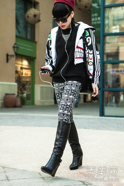 个性图案连帽休闲外套,选择灰色卫衣下穿个性花纹紧身裤和黑色坡跟中筒靴子来搭配,运动风格,随性大方。吴莫愁一贯的另类味道,墨镜为这身搭配增色不少呢。