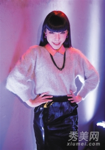 毛绒毛衣搭配黑色皮质铅笔裙,乖张中透着小个性的感觉,挺有鬼马精灵范儿呢。