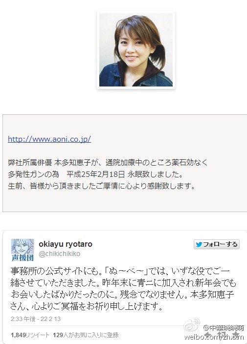 春夏声优本多知惠子不幸因病去世