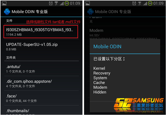 膜拜完大神之后开始进入正题吧,“MobileOdin”字面意思就是“手机版Odin”,就是把本该在电脑上使用的线刷包存到手机上来并用Mobile Odin加载进行刷机。你说它是线刷吧,它不用连接数据线,你说它是卡刷吧,它用的刷机包又是.tar或者.md5线刷包。而且,它还能在刷机过程自动进行ROOT,并且还有三wipe功能!好吧,你就把它理解成介于牛A与牛C之间的刷机神器就行了。下面我以刷“9305港版官方ROM_4.1.2_I9305ZHBMA5”为例,刷机包文件为“I9305ZHBMA5_I9305TGYBMA5_I9305XXBMA2_HOME.tar.md5”。