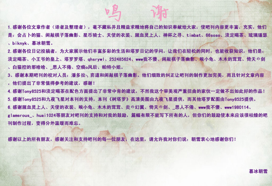 为了保证本吧吧刊文图作者的权利,制作人不会向任何人提供吧刊作者原文、作者原图和吧刊成品图,想要欣赏吧刊内容的朋友请下载吧刊阅读。本吧吧刊内容不得用于商业用途,转载者请先征询文图作者同意,谢谢!
