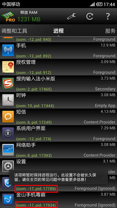 可见由2/10改为了-17/-17,但该更改不会被长久保留,某一进程omm_adj阀值由于新进程的不断加入而变大中,但最大为15,因此oom_grop也随之变化,这正是安卓系统的内存优化机制,排排坐,吃果果,会哭会闹,有糖吃,即同一程序不同时期不同oom_adj阀值,不同程序同一时期相同oom_adj阀值,而后当剩余内存达到minfree警戒值时,触发安卓系统的内存回收机制,不同oom_adj阀值,阀值大的先被回收,相同oom_adj阀值,内存大的先被回收……