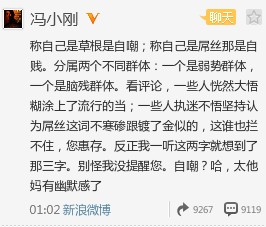 2、称自己是草根是自嘲;称自己是屌丝那是自贱。分属两个不同群体:一个是弱势群体,一个是脑残群体。看评论,一些人恍然大悟糊涂上了流行的当;一些人执迷不悟坚持认为屌丝这词不寒碜跟镀了金似的,这谁也拦不住,您惠存。反正我一听这两字就想到了那三字。别怪我没提醒您。自嘲?哈,太他妈有幽默感了。