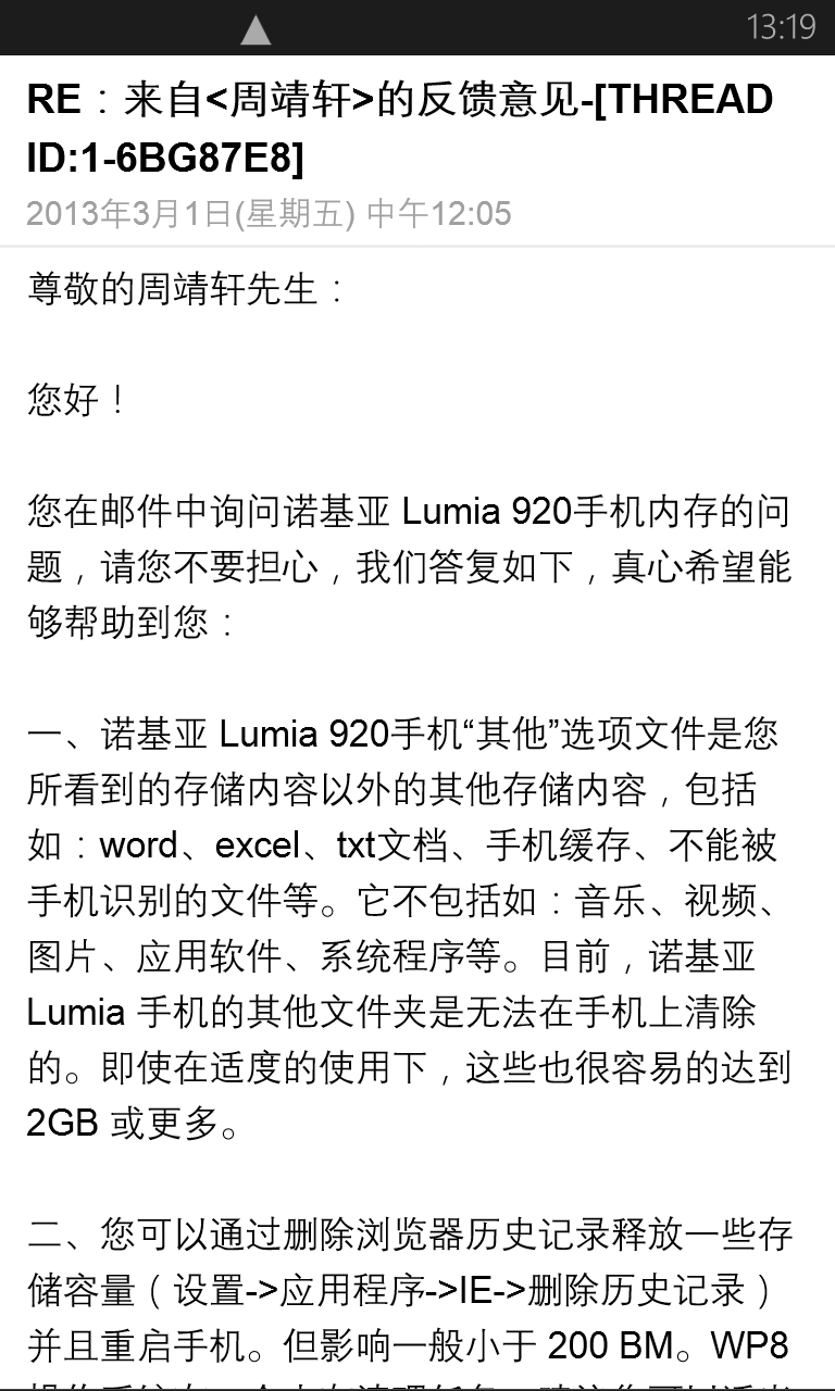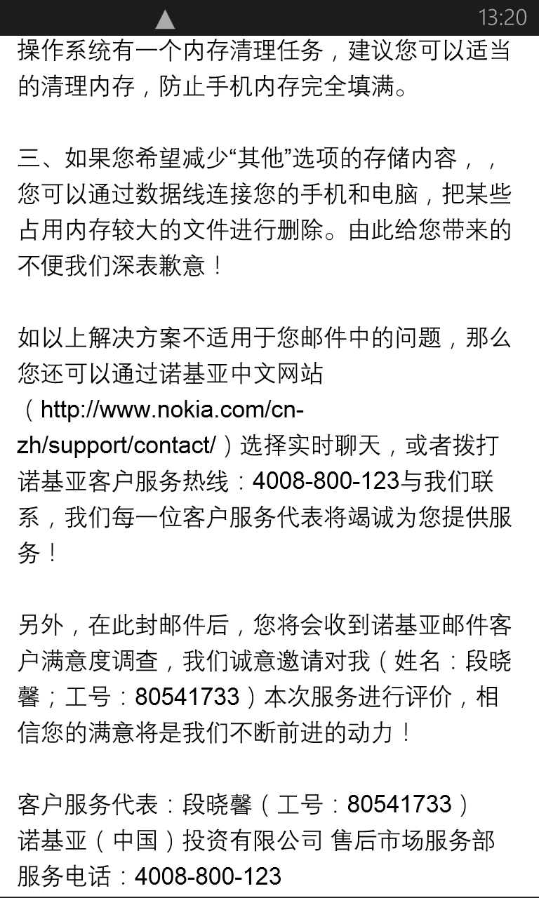 我在昨晚骚扰了下诺基亚售后,9点多发的邮件,第二天十二点多回。效率还不算差。