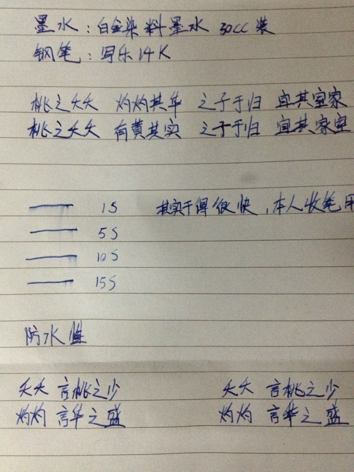 这墨水干得很快 在各种纸上都试了 不怎么洇 但不防水 遇水就掉色