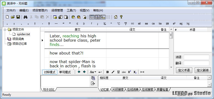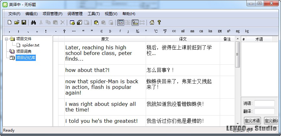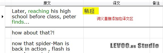 我们可以定义用户术语或新词,下次再遇到该词,便可以按上边所说的方法翻译词义了,比如,要定义“spider-man” 为“蜘蛛侠”,在左侧的原文区选中spider-man词组,该词组会自动复制在定义区,如图: