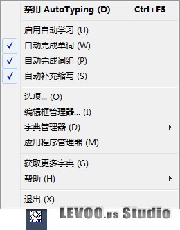 该软件将自动记录下你所输入的单词,词汇,以便下次再输入;支持缩写;同样也可以设置输入习惯,在软件图标上点击鼠标右键,如图: