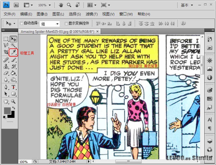 打开的漫画图片,旁白部分为黑字黄底,要掩盖字体就需要为笔刷取得与原图黄色背景相似的颜色,然后用笔刷把字体“刷”掉;点击PS工具箱上的吸管工具,然而点击旁白部分的黄色背景,如图: