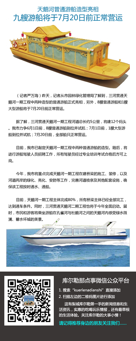 天鹅河普通游船造型亮相,九艘游船将于7月20日前正常营运。