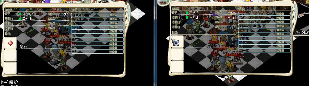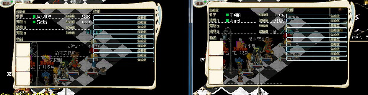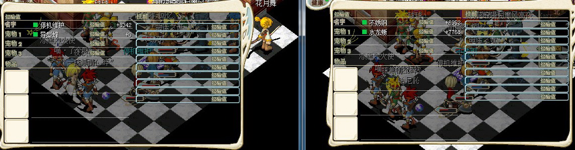 两个相同等级的人,所带的宠物等级是不同的,但是两个人的经验相同,这个现象虽然早就知道但还是放张图证明一下。也算是做下面测试能够模拟同一人的一个依据。所以下面结论的提出,可以认为是基于一个人得出的。测试2、带宠情况下,带队与不带队的经验对比。(两个号轮流带队,计算结果精确到小数点后5位,也就是xx.xxx%,下同)