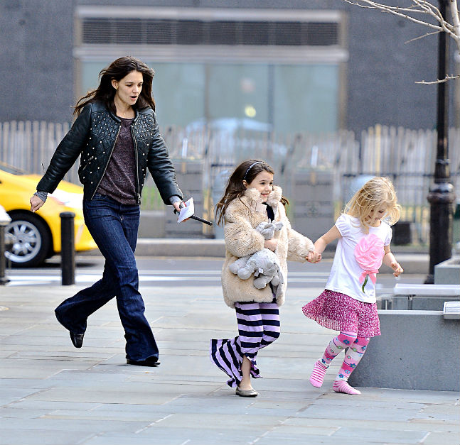 Katie Holmes was collecting the two little ones from her friend's aparement building. The trio were then seen running through the streets, aiming to reach their waiting car without being photographed by paparazzi.
