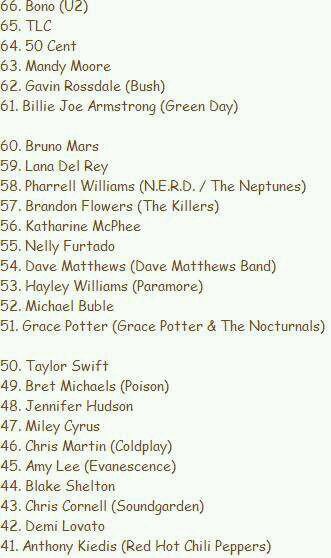 其中Top 10完整榜单:01. Beyoncé 02. Rihanna 03. Justin Timberlake 04. Jennifer Lopez 05. Shakira 06. Adam Levine 07. Britney Spears 08. Nicole Scherzinger 09. Usher 10. Alicia Keys
