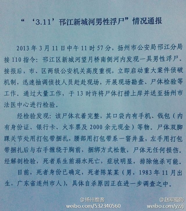 扬州网讯(尔部)昨天下午,位于望月桥附近的新城河中发现一具男尸。市、区两级警方立即启动命案处置预案,迅速抽调侦技人员赶赴现场,经勘查检验死者系溺水自杀身亡。