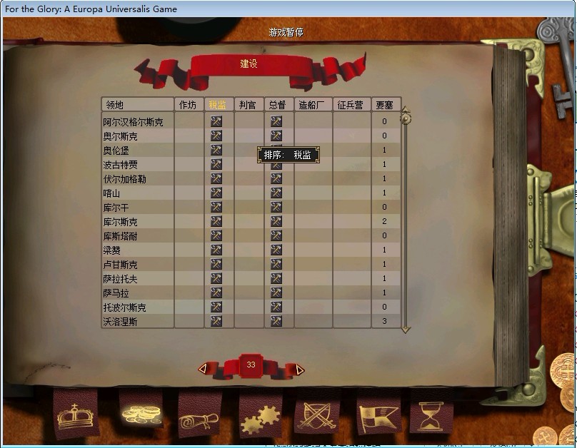 比如.A,B,C,D省,其中C和D已经有税务官,A和B没有.左上角图标一显示.未升级的税务官A省份,B省份。然后点一下。A,B省开始升级官员。图标二显示C省和D省有未升级法律官员,点击一下.C,D省份同时开始升级.