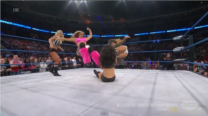 两人完美的合作,同时对gail使出dropkick!