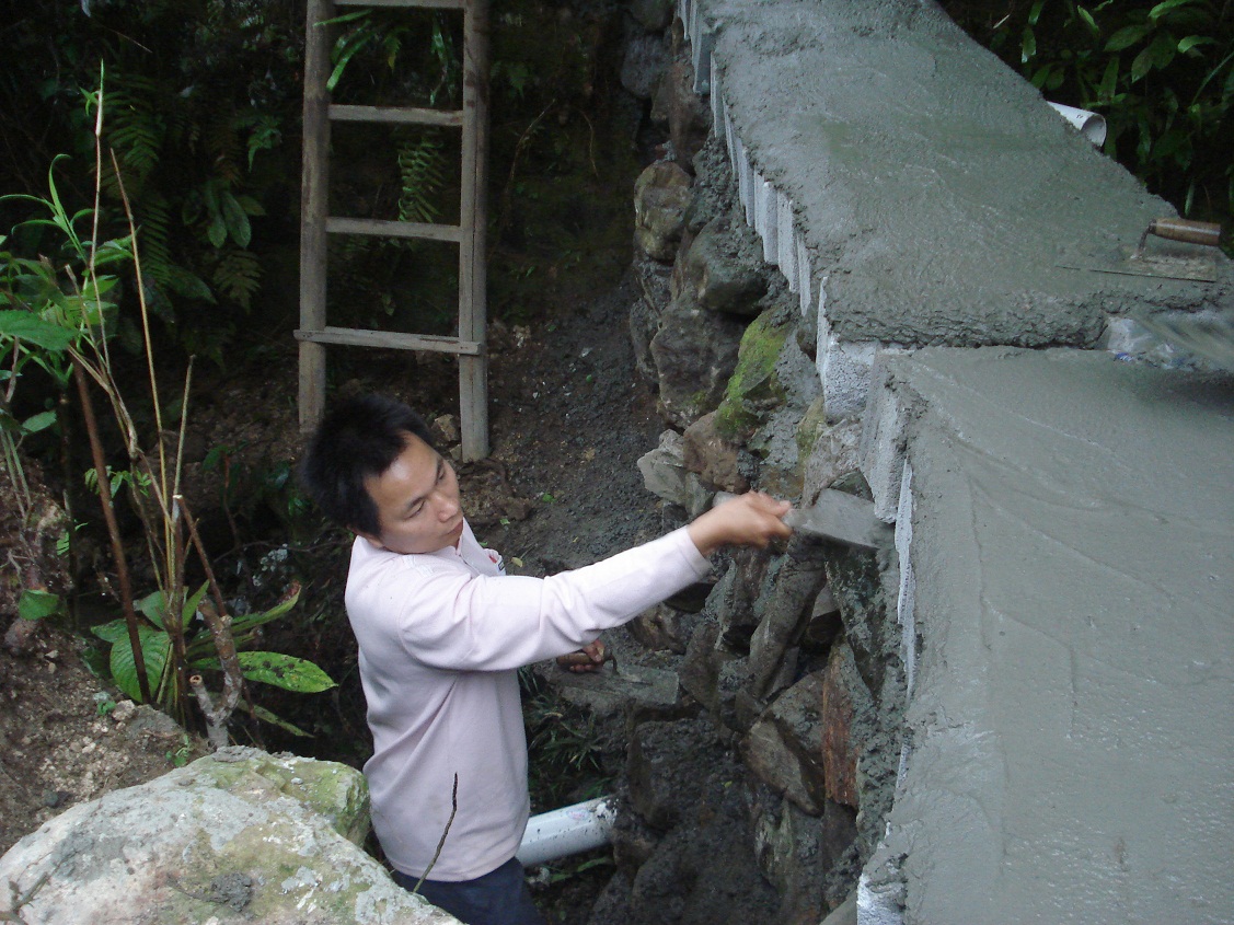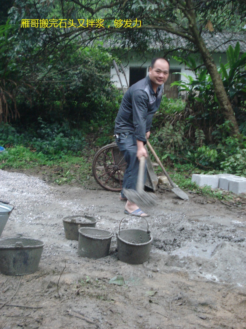 周六施工一天,我们把前面备的水泥,沙子用完,才砌了一半高度,因为担心下大雨导致工程前功尽弃,我们决定趁热打铁,于是周日果断进山继续奋战。上午只有我们几个伙计和陈师傅投入战斗,中午时分阿靓和司令以及鳄鱼王的司机因运输沙子和石粉才陆续赶到,他们也立即支援,下午虽天公不作美,下起小雨,仍然无法阻挡我们高昂的士气,兄弟们带上草帽,搭上雨篷,最终在一番冒雨奋战下,在天暗下来前使得筑坝顺利完成。