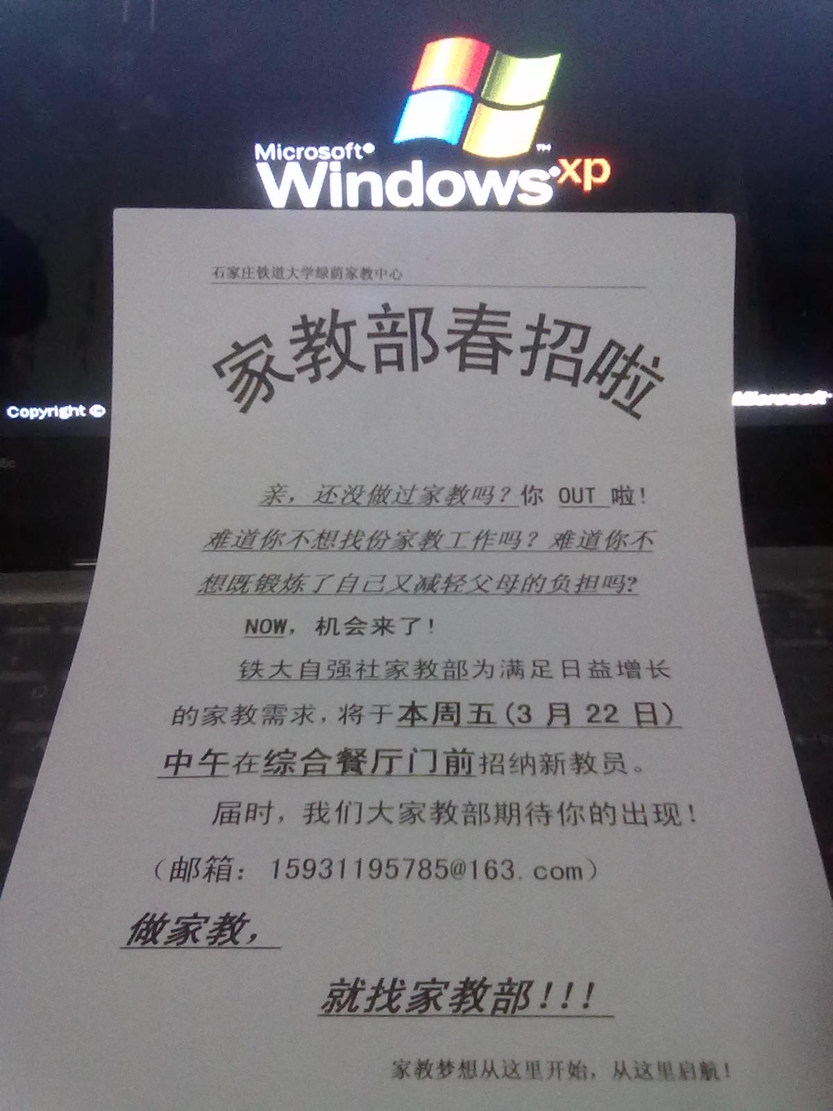 铁大自强社家教部为满足日益增长的家教需求,将于本周五(3月22日)中午在综合餐厅门前招纳新教员。